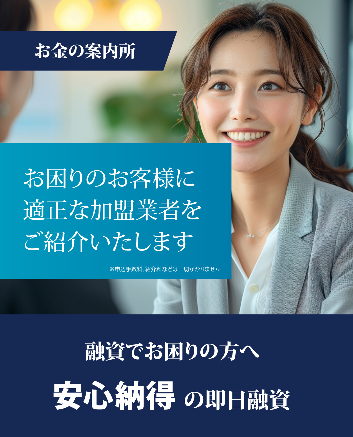 - 優良加盟業者の中からご自身の付き合いやすい業者をお選びいただき融資を受けることが可能です。